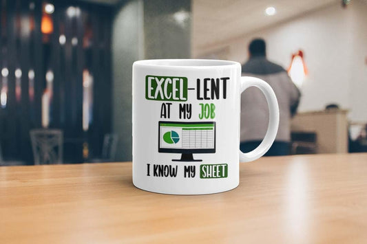 VIROSA Funny Work Mug – Excel-Lent at My Job, Know My Sheet – Gift for Coworkers, Boss, Accountant, Data Analyst or Office Nerd – Spreadsheet Joke – 11oz White Ceramic Coffee Cup
