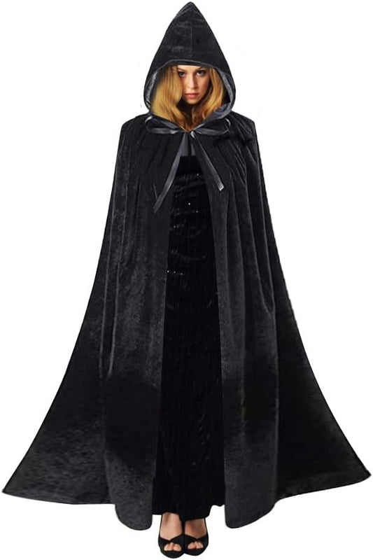 Unisex Value Black Velvet Style Hooded Cape - Adult/Kids Fancy Dress Costume for Halloween and Parties