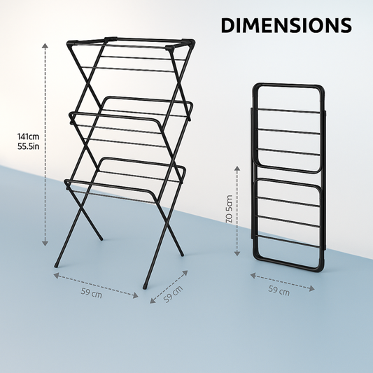 VIROSA 3 Tier Clothes Airer Drying Rack – Foldable Indoor & Outdoor Laundry Stand with Non-Slip Feet & Hanger Corners – Lightweight Space-Saving Design – 63 x 46 x 138cm – Black