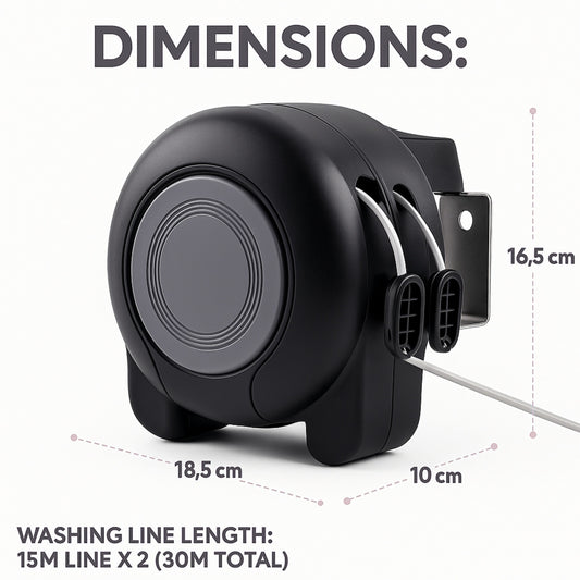 VIROSA Retractable Washing Line 30m – Dual Clothesline Dryer with Twin Cable – Heavy Duty Wall Mounted Laundry Reel for Indoor & Outdoor Use – Space-Saving Tangle-Free Design – Black