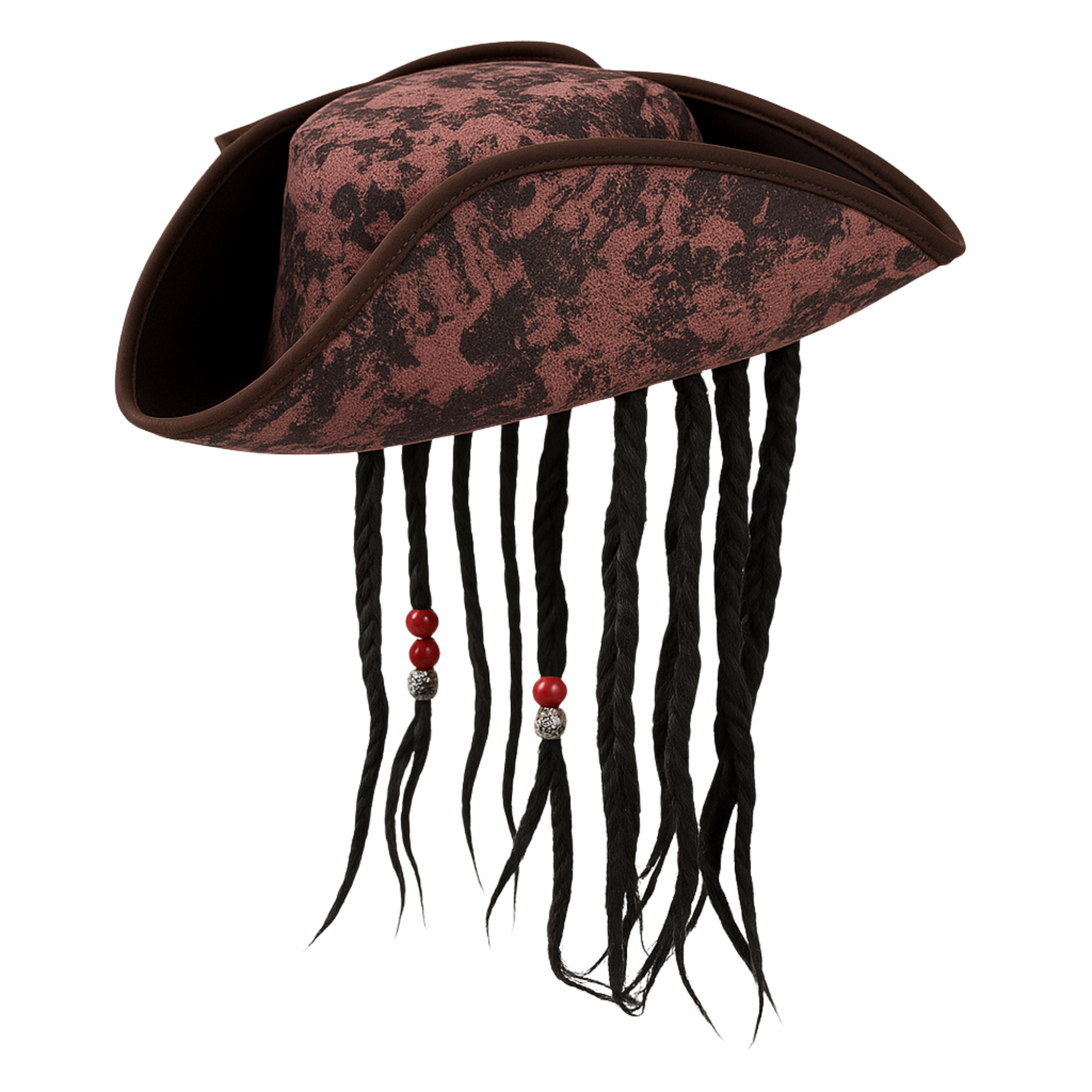 - Deluxe Pirate Hat: Brown faux-leather look with built-in long black braids and beads